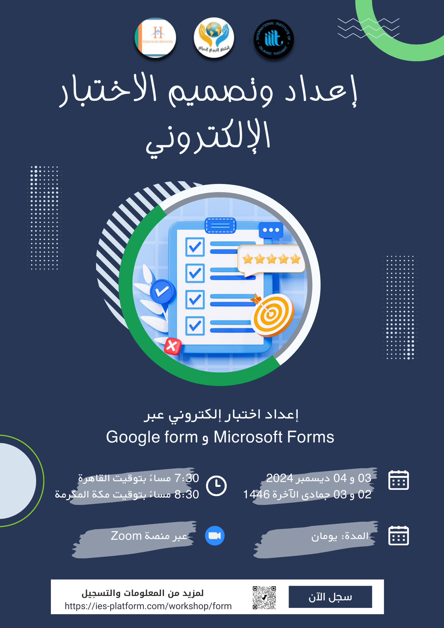 في هذا البرنامج التدريبي، سنتعلم كيفية إعداد وتصميم اختبارات إلكترونية تفاعلية ومتقنة باستخدام مايكروسوفت فورمز وجوجل فورم، سنتحدث عن التخطيط، والتصميم، والتنفيذ، مع التركيز على جانب التطبيق.